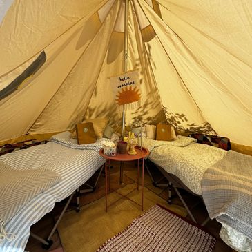 Our glamping experience transcends the ordinary, providing a haven of comfort to cradle you after a day filled with sisterly connection, learning, and personal evolution. Choose from our thoughtfully designed 4-person tents, our 3-person tents or intimate 1-person tents, each crafted to ensure your utmost comfort and adorned with cozy linens to beckon you into a night of restful rejuvenation.